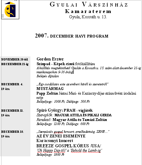 A Gyulai Várszínház részletes decemberi programrendje itt.