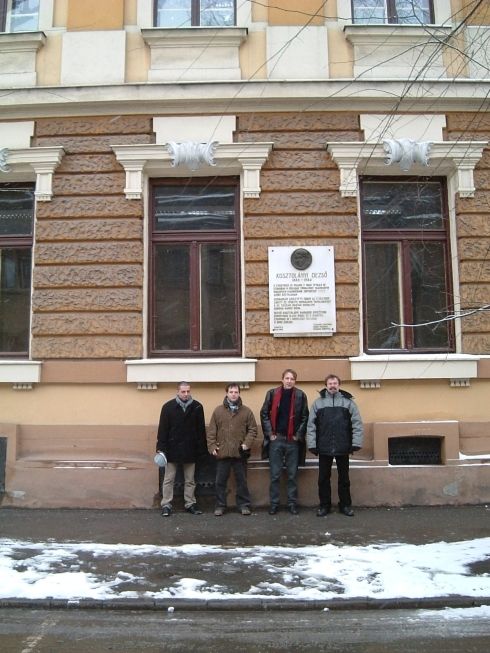 Kosztolányi gimnáziumánál (Szabadka; SzT, Kiss László, Kiss Ottó, Elek Tibor)