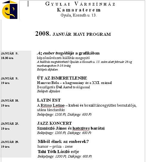 A 2008-as év első hónapjában is színvonalas programokkal várják az érdeklődőket a Gyulai Várszínház Kamaratermébe. Január 9-én este fél hétkor nyílik az a grafikai kiállítás, amely Madách Imre: Az ember tragédiája című drámához készült illusztrációkat mutatja be. Nagyon sok neves grafikust megihletett az egyik legismertebb, legfilozofikusabb magyar dráma, Az ember tragédiája. Sokan készítettek sorozatokat a műből az egyes színeket megjelenítve, de készültek egyedi alkotások is. A Nemzeti Színház tulajdonában van az az anyag, amely most Gyulán is látható. A kiállított grafikai másolatok neves képzőművészek munkái: Haranghy Jenő, Zichy Mihály, Hincz Gyula, Kass János, Kondor Béla, Würtz Ádám, Bálint Endre, Lukovszky László. Január 9-én este 7 órakor egy érdekes beszélgetésre kerül sor. Nyáron mutatta be a Gyulai Várszínház Hamvas Béla: Karnevál című regényét felolvasószínházi formában. Az első előadás előtt egy beszélgetést hallhattak Dúl Antal teológussal, a Hamvas életmű gondozójával az író gondolatvilágáról, az élet nagy kérdéseiről. Akkor olyan izgalmas beszélgetés alakult ott ki, hogy megígérte Dúl Antal, szívesen folytatja az előadást egy más alkalommal. Erre ezen az esten kerül sor Út az ismeretlenbe címmel. Mindenkit várnak, akit érdekelnek a XXI. századi ember és a világ kapcsolatának kérdései, Hamvas Béla szellemi öröksége, a hagyomány és a modern világ kapcsolata.