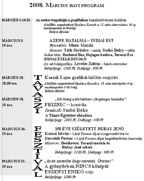 Március 26-án komolyzenei hangversenyt rendeznek a Kamarateremben a 150 éve született a zseniális hegedűművész, zeneszerző Hubay Jenő emlékére. Páratlan vállalkozásként az ő összes művét cd-re rögzítette a Hungaroton Classic Kiadó két kiváló művész tolmácsolásában. A Liszt Ferenc-díjas előadók, Kassai István zongoraművész és Szecsődi Ferenc hegedűművész ebből a gazdag anyagból mutat be egy válogatást a gyulai koncerten. Az est első részében az ő tolmácsolásukban hallhatjuk a kikeletet köszöntve Beethoven: Tavaszi szonáta című darabját is.