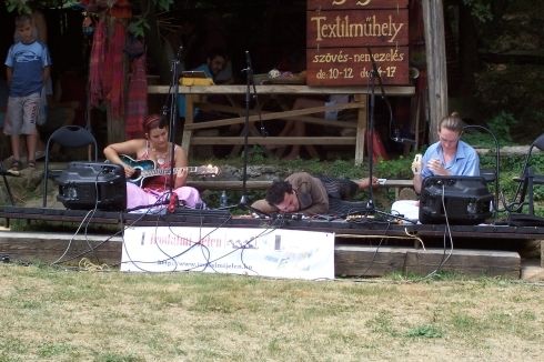Weiner Sennyey Tibor és kis társulata nyitja a napot, a háttér az Erzsuzsóka Textilműhely, ami nem biztos, hogy nyerő húzás, de előbb-utóbb megszokod. A „legmeghatározóbb tulajdonsága ugyanis a kettősség volt”, halljuk egy ízben, és ez a kijelentés mintha a félórás produkcióra is vonatkoztatható volna, ha az elhangzó versdarabokat, verstörmelékeket a prófétai hang és az ironikus hétköznapiság keveredéseként értelmeznénk. Ebben az esetben azonban nem tudnánk mit kezdeni a „gyermekektől távol tartandó” kitétellel, a hangulat ugyanis idilli: sétálgató párocskák, csendes poharazgatás, itt-ott konok követése az árnyéknak. A pajta melletti Kávéház családias atmoszférájához a zenei kíséret is hozzájárul (a szerző tilinkón, Gál Emese fuvolán, Kocsi Lajos gitáron), kertet varázsolnak a kisház és a magát a délelőttből kifekvőtámaszozó Weiner Sennyey Tibor köré. Több, mint performance, de még nem színház – hallani, megvan rá az esély és az ötletek.