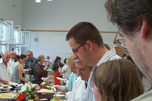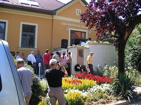 [SzT] A tábor zárlata az általános iskola zsibongójában, nagy asztalok, töltött káposzta, túrós rétes, kakaspörkölt komolyabb mennyiségben, jó sokan maradtak, a hangulat kellemes, búcsúbeszédek, a tábor támogatójának (Civis Hotel szállodalánc) köszöntője, napfény, lassúság, másnapos fejek. Aztán Mezey Katalin laudálja a Tokaji Írótábor Díja kitüntetettjét, Iancu Laura költőt. A díjazott szerényen beszél munkájáról, életéről, motivációiról, szépen megköszöni az elismerést, családias jelenet, jó kép. Majd újabb díjak, hordókat osztanak arra érdemes íróknak-költőknek, a legnagyobbat Szilágyi István kapja. Végül evés-ivás, beszélgetések, búcsúkézfogások, kezdenek elszállingózni kortárs irodalmunk jelesei, Elek főszerk is indulást vezényel, eltűnnek Kiss Lacival a híd előtti körforgalomban. Mi még üldögélünk valameddig az iskola lépcsőjén, Pankám meg én, nézzük a távozókat, elköszönünk Onagytól, Zalán nyújtja a kezét, azzal tényleg vége, új célt keresünk, mert ez itt, láthatóan, máma már nem hasad tovább.