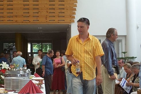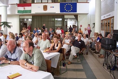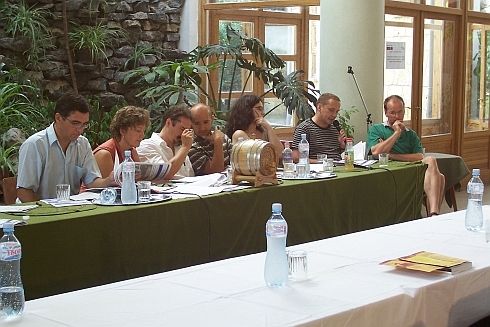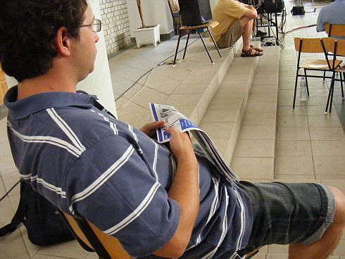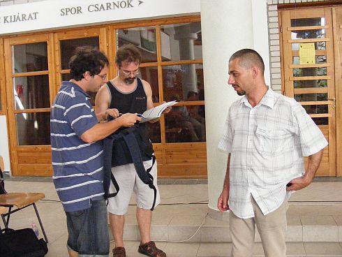[SzT] Késések, kavarodás – első Tokajom nehezen indul. A tábor megnyitója 11.15-kor a főtéren lévő Rákóczi-pincében, de nem érek oda (a 47-es úton végig csúcsforgalom, Debrecen környékén járunk, amikor telefon Kiss Lacitól, ők (Elek Tiborral) Sarkadnál tartanak, Grecsó csak később érkezik, Pestről), már A Biblia és Tokaj évszázadai című kiállításra vonul a népes társaság, amikor csatlakozom, Vass Tibi segít eligazodni, mondja, mit hol találok, mikor mi lesz, jókedvű, lelkes. A Digitális irodalom szekcióban koreferálok másnap, kérdezem Tibit (mint szekcióelnököt), hogy megkapjuk-e előre az előadások szövegét. Nem. Nem baj. A kiállítóterembe viszont nem férünk be. Iszonyatos meleg van az utcán. (Néhány nap múlva láttam a tárlatot, szép, gazdag, érdekes. A Vizsolyi Biblia egy példánya a főtárlóban, és olyan helyen kinyitva, ahol épp csiklandós a történet – észrevette-e valaki, vajon?)