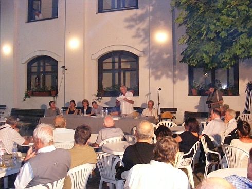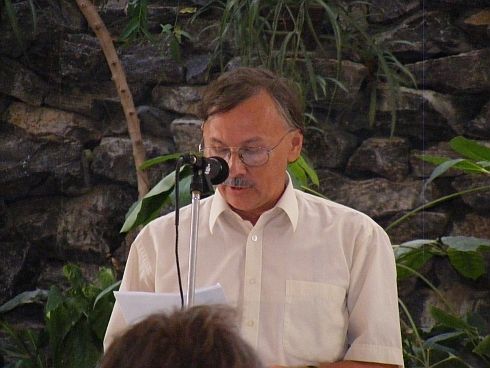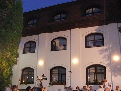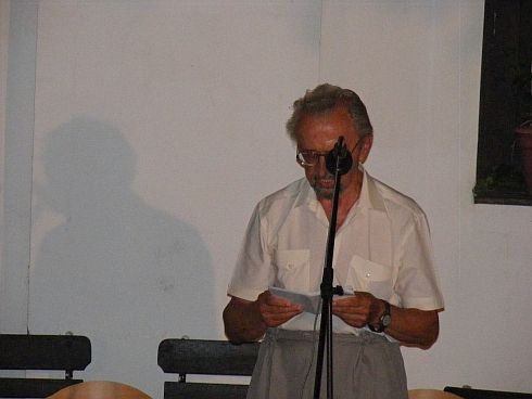 [KL] Az első este egyik fő programpontját – a délutáni konferencia-előadásokon túl, a Veresszekér fogadóban elővezetett felolvasásokon innen – a határon túli folyóiratok bemutatkozása (bemutatása) jelentette: Helikon, Híd, Kalligram, Irodalmi Szemle. A kollégium udvarán megtartott szimpózium szereplői közül elsősorban Szilágyi Istvánt emelnénk ki. Sokadszorra gondoltuk úgy, hogy legnagyobbrészt folyóiratokhoz kötődő publikum előtt lapokról, azok történetéről, mindenkori koncepciójáról felolvasásos előadást tartani nem a legszórakoztatóbb dolog. Eleinte a Helikon főszerkesztője is ránk ijesztett, de néhány perc elteltével megkaptuk, amire számítottunk: Szilágyi István, eldobva papírjait, a stílusának megfelelő lendületes retorikájú, izgalmas élőbeszédre váltott át, leginkább támogatásról és pénzről, és leginkább annak hiányáról. Gesztusa, amellett, hogy élvezetessé tette azt, amiről percekkel azelőtt épp ezt nem lehetett gondolni, egyben parázs vitát is indukált. A szópárbaj két pólusán, meghatározva a mondottak irányát és súlyát, egyre inkább L. Simon László és Mészáros Sándor építette ki védőállásait. A kérdés: legyen-e ennyi (mennyi?) folyóirat. Legyen: hiszen ha nincs, ugyan milyen fórumon tájékozódna a kultúraéhes olvasó a regionális eseményekről, vö. ’56 a székelyeknél. Ne legyen: ugyanis nincs olvasótábor. Mészáros Sándor termékenyen provokatív stílusban leszámolt a folyóirat-kultúra fogalmával, melynek helyébe a könyvkultúra kifejezést javallotta. És hogy a honi folyóiratok döntő része képtelen a megújulásra. Ellenpéldaként a Műút és az Árgus volt említve (mi persze tudtunk volna egyéb példákkal is szolgálni, PRAE?, Műhely? maga a Kalligram?, Bárka?), amit L. Simon László élből, ahogy azt békéscsabai látogatása alkalmával is tette: adatokra, statisztikákra hivatkozva cáfolt. És így ment ez, sajnos nem nagyon sokáig – hamarosan kezdetét vette a fogadós olvasás.