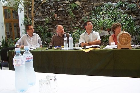 Mizser Attila beszél, Németh Zoltán és Elek Tibor konzultálnak, a többiek meg rém komolyak