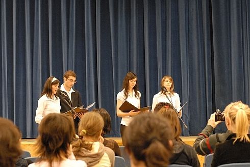 Nem is akármilyennek, méghozzá. Valóságos rítus közepébe csöppenünk – ceremónia zajlik a színpadon. Az iskola igazgatónője, Czeglédiné dr. Gurzó Mária kedves szavakkal köszönti a Vendéget és a nagyérdeműt (melynek soraiban „külsősök” is szép számmal helyet foglalnak). Őt dr. Perjési Klára polgármester követi, hangsúlyozván Kányádi Sándor Gyulára látogatásának fontosságát, majd rövid életrajz-ismertetés következik, hogy aztán vers hangozzék el egy alsóbb évfolyamos diáklány tolmácsolásában (a csodaszép és titokzatos Hallgat az erdő). Végül, Kányádi Sándor színre lépése előtt, kultúr-egyveleget láthatunk a költő műveiből, jó érzékkel összeválogatva, ügyesen szerkesztve – egy fiú, három lány. Disszonáns (mert százötven ember előtt minden diák izgul) és harmonikus (mert összecsiszolt) a produkció; idézetek, vallomások, zárásképp egy Eminescu-fordítás – kicsit talán hosszú, de remek.