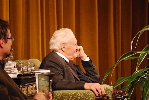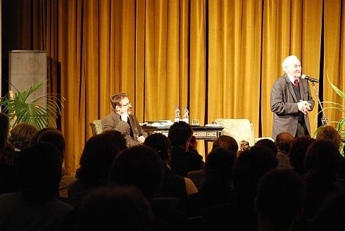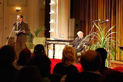 A nyolcvanéves alkotó vigadóbeli produkciója többféle értelemben is rendhagyó felolvasóest. Nincs felolvasás, például. Van viszont kétszáznál több ember, a fele se ismerős, jöttek az egész megyéből legendát nézni-hallgatni, olyanok is, akik máskor nem irodalmi programot választanak kedd este hétre. És nincs beszélgetés. A vendég kiáll a mikrofonhoz, levegőt vesz, aztán jó másfél óra hosszat nyomja az átütő stand up comedyt. Elképesztő az öreg, megállíthatatlanul folyik belőle a szó, és szellemes, összeszedett végig, miközben olyan belső szabadságot sugároz minden gesztusa, hogy hasonlóval se találkozott még a tudósító.