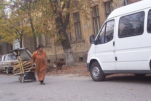Nő húz, kutya szarik, a márkás mikrobusz belóg a képbe. Valóság, Beregszász