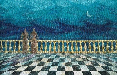 Kitekintés a hihetőből. E mű címéből arra következtethetünk (akár anélkül, hogy látnánk a kárpitot), hogy az ábrázolás egyesíti magában a valóságosat és a valóságoson túlit. Ha viszont rápillantunk, azonnal szembetűnik, hogy már maga a hihető is képzeletszerű. Természetesen a nézőt is foglalkoztatja, hogy mi minden rejtőzhet a korlát mögött, vagy a levegőég sűrű sötétjének távolában. Magán a horizonton a baluszteres korlát párkánya feszül, amelyen az ábrázolás két szereplője kezét nyugtatja. E biztonságot nyújtó támasz mögül kitekintve pásztázzák az ismeretlent, a titkosat, a végtelent, amely tudjuk, olyannyira érdekli az embert ősidők óta.